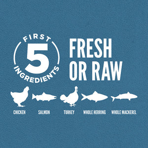 - The first 5 ingredients are fresh or raw poultry and fish ingredients. Our fresh ingredients use refrigeration as the sole method of preservation and our raw ingredients are frozen at their peak freshness.