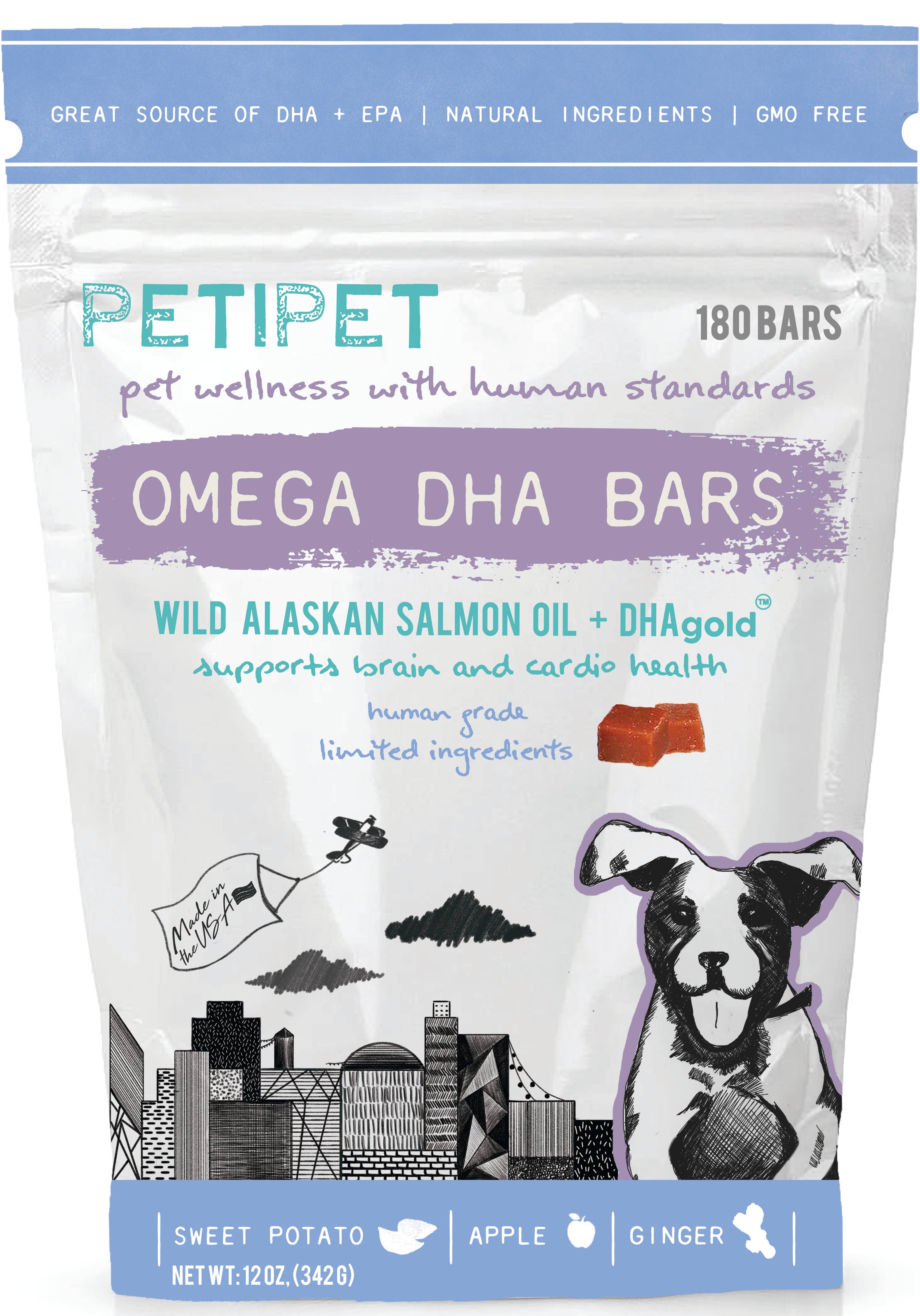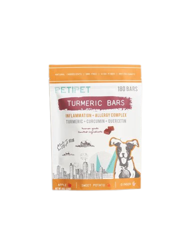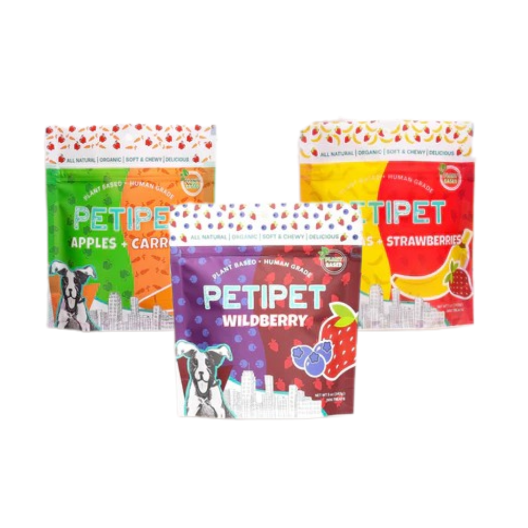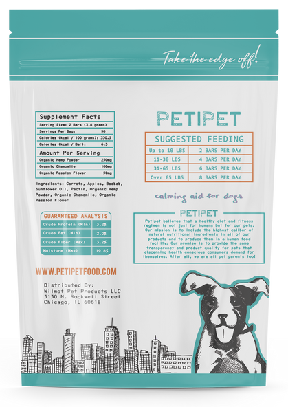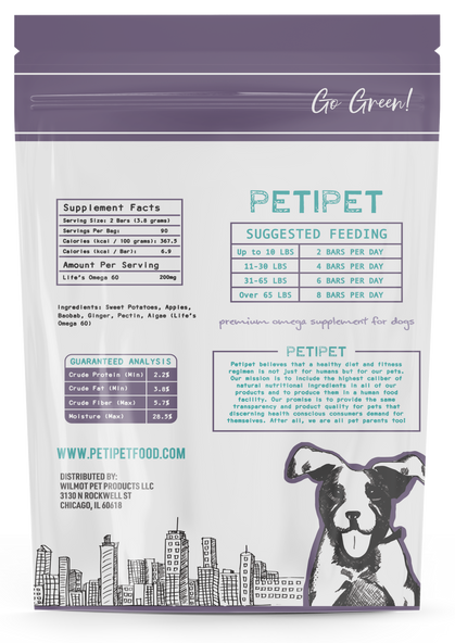 All Petipet products are formulated by and for those who know pets are at their best when they are getting the nutrients they need and the quality they deserve. This is why we use only Human-Grade ingredients, and fortify our Bars with the highest quality active ingredients. We created raw, GMO-free, plant-based treats using real fruits and vegetables for our own pets, so we know what dogs and their owners are looking for: great tasting and rewarding treats that don’t have the foul smells and dangerous ingredients found in most dog products. We’ve crafted a new style of dog treat. We don't make a biscuit, pill-pocket or cookie. Our Bars are a mix of real apple, sweet potato, carrot, baobab and ginger to create a delicious plant-based and Human-Grade delivery system for effective servings of joint support, skin and coat support, itching and allergy relief, anxiety relief, Omega 3s, Fish Oil, DHA, Turmeric and many other important dietary supplements that will help your dogs live at his or her best.