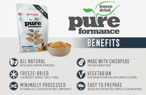 Pureformance Pet Food is a whole new approach to freeze-dried pet food.Our delicious selection of unique proteins such as Chicken, Lamb,Rabbit or Goat are accompanied by highly nutritious chickpeas, fruitsand vegetables. Chickpeas are valued for their high protein andextremely low glycemic index. Grandma Lucy's Pureformance uses simpleingredients to bring your pet the best simple nutrition.