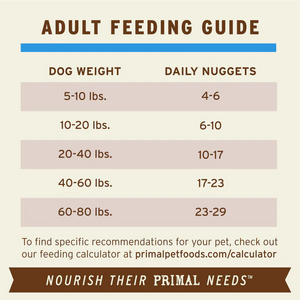 Only serve Primal raw foods when completely thawed—frozen foods can be difficult for animals to digest. Never microwave any pet food.