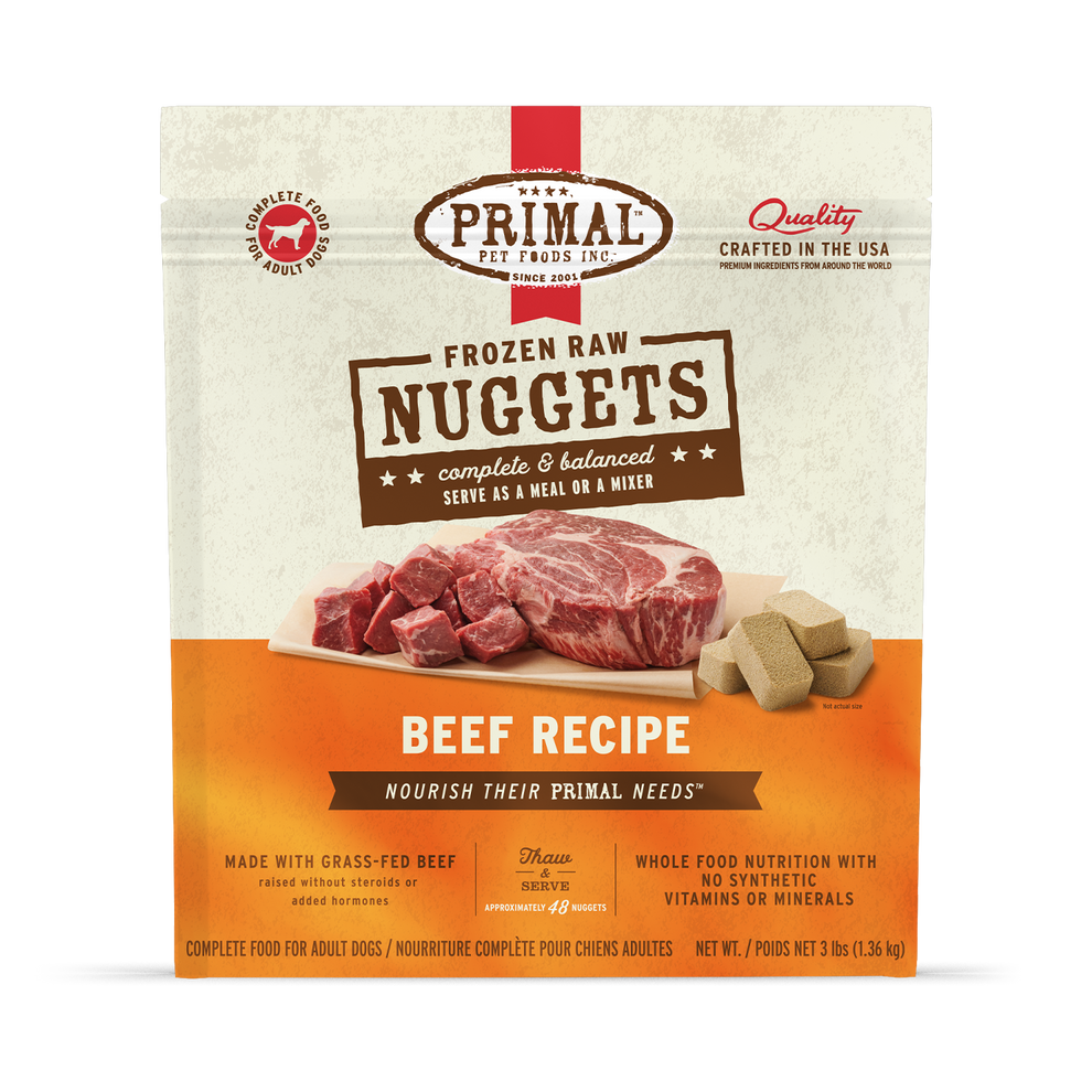 Canine Raw Frozen Nuggets are available in 3 lb and 6 lb resealable bags.