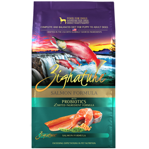 Fill your best friend's bowl with wholesome nutrition when you feed them Zignature Salmon Limited Ingredient Formula Grain-Free Dry Dog Food. Your pup will enjoy a delicious dinner made with real Salmon from the Northwest US, wholesome peas, chickpeas, and flaxseed. This meat-first recipe offers pups the protein they need to thrive, while Zignature's limited ingredient recipe throws out troublesome ingredients like chicken, corn, wheat, soy, and potatoes, creating peak hypoallergenic, low-glycemic nutrition. Combine that with key antioxidants, essential fatty acids, and a complete spectrum of vitamins and minerals for a well-rounded meal that goes beyond nature to become your pet's signature food for life.