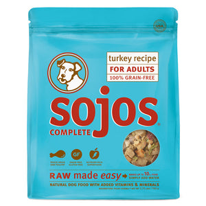 Give your pooch the simple power of raw nutrition in just minutes with the Sojos Complete Turkey Recipe Adult Grain-Free Freeze-Dried Raw Dog Food. Made with real, fresh turkey as the first ingredient plus sweet potatoes, cranberries, whole eggs and flaxseeds, it€™s packed with protein and nose-to-tail nourishment from raw ingredients in every bite. The vet-recommended formula is gently freeze-dried to preserve the natural enzymes, vitamins and trace nutrients, and is loaded with health-boosting superfoods like ginger, kelp, pumpkin and more. Just add water, soak to activate the raw goodness, and watch your pooch dive into his bowl every time!