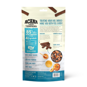 ME (calculated) is 3340 kcal/kg, 47 kcal/treat. ACANA High Protein Tenders Chewy Salmon recipe is intended for intermittent or supplemental feeding only. Treat intake should not exceed 10% of daily caloric intake.