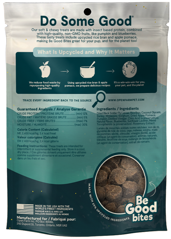 Our Plant Recipe with Pumpkin Soft & Chewy treats are made with high-quality non-GMO wholesome grains & fruits, like pumpkin and blueberries. These treats included 30% upcycled ingredients, making Be Good Bites great for your pup and the planet too!