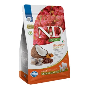 herring, dehydrated herring, pea starch, herring oil, quinoa seed, flaxseed, dried coconut, turmeric, inulin, fructooligosaccharide, yeast extract, calcium carbonate, dicalcium phosphate, psyllium seed husk, potassium chloride, salt, brewers dried yeast, glucosamine hydrochloride, chondroitin sulfate, vitamin A supplement, vitamin D3 supplement, vitamin E supplement, ascorbic acid, niacin, calcium pantothenate, riboflavin, pyridoxine hydrochloride, thiamine mononitrate, biotin, folic acid, vitamin B12 supplement, choline chloride, beta-carotene, zinc methionine hydroxy analogue chelate, manganese methionine hydroxy analogue chelate, ferrous glycine, copper methionine hydroxy analogue chelate, selenium yeast, DL-Methionine, taurine, L-Carnitine, aloe vera gel concentrate, green tea extract, rosemary extract, mixed tocopherols (a preservative).