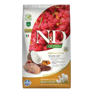 quail, dehydrated quail, pea starch, herring oil, quinoa seed, linseed, dried coconut, turmeric, inulin, fructooligosaccharide, yeast extract, calcium carbonate, dicalcium phosphate, psyllium seed husk, potassium chloride, salt, brewers dried yeast, glucosamine hydrochloride, chondroitin sulfate, vitamin A supplement, vitamin D3 supplement, vitamin E supplement, ascorbic acid, niacin, calcium pantothenate, riboflavin, pyridoxine hydrochloride, thiamine mononitrate, biotin, folic acid, vitamin B12 supplement, choline chloride, beta-carotene, zinc methionine hydroxy analogue chelate, manganese methionine hydroxy analogue chelate, ferrous glycine, copper methionine hydroxy analogue chelate, selenium yeast, DL-Methionine, taurine, L-Carnitine, aloe vera gel concentrate, green tea extract, rosemary extract, mixed tocopherols (a preservative).