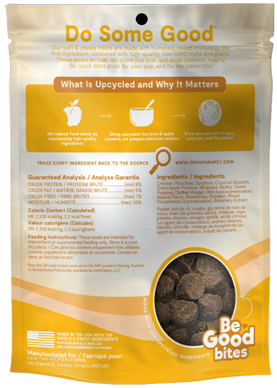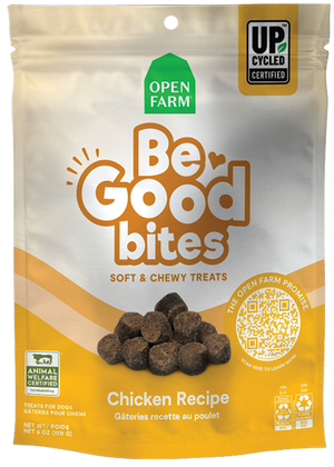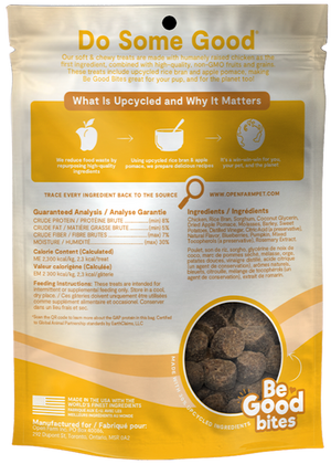Our Chicken Recipe Soft & Chewy treats are made with humanely raised chicken as the first ingredient, combined with high-quality non-GMO fruits & grains. These treats included 30% upcycled ingredients, making Be Good Bites great for your pup and the planet too!