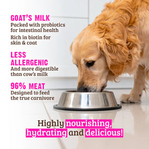 With Goat's Milk 96% Chicken & Chicken Liver Dog Food Goat's milk is an excellent source of protein and helps support digestion Fenugreek seeds promote healthy blood sugar levels No xanthan gum, guar gum or carrageenan No BPA used in can linings 100% nutritionally complete 100% profits donated THE BENEFITS...
