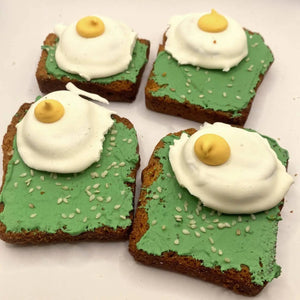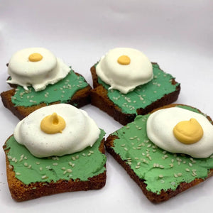 We took some time to come up with this one. It is all cookie! The toast is a crunchy maple cookie and the "egg" is a crunchy vanilla honey. Both coated in our yogurt icing which drys hard. COlor may vary for the "avocado" since we make the icing in small batches. But we endeavor to keep it as consistent as possible. The toasts have been re-formulated to be crunchy but not too dense and a little larger! Ingredients: Toast: Organic Whole Wheat Flour, Organic Brown Sugar, Organic Certified Humane Eggs, Organic Oatmilk, Local Honey, Organic Vanilla, Organic Sesame Seeds Icing: Non-Fat Milk Solids, Yogurt Powder, Tapioca Starch, Tapioca Maltodextrin, Dextrose, Modified Plant Starch, Apple Pectin "Fried Egg"; Organic Flour, Organic Certified Humane Eggs, Organic Canola Oil, Local Honey, Organic Vanilla.