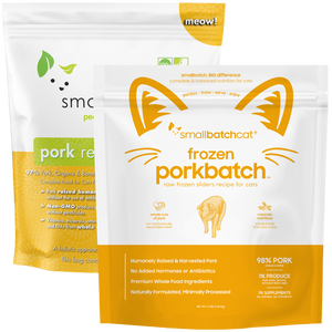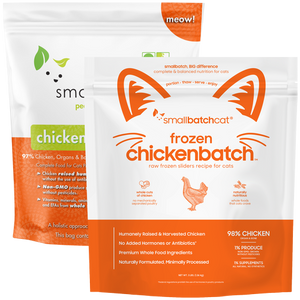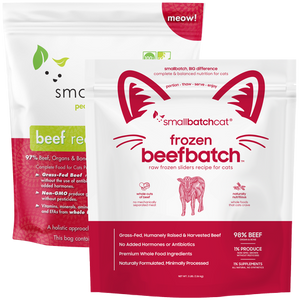 Single-source protein, complete raw diets for cats featuring 97-98% meat, organ and bone.