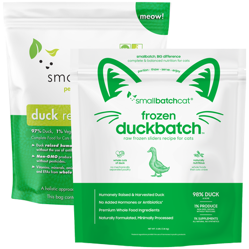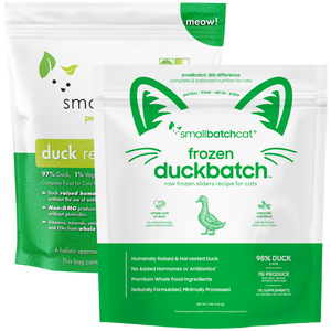 97% humanely raised and harvested duck, 1% organic produce, 2% natural supplements