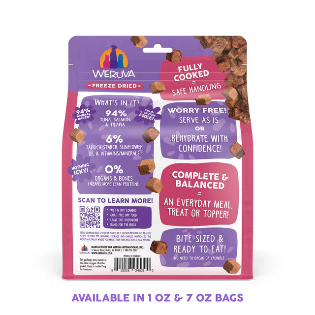 Gently cooked with 94% tuna, salmon, and tilapia and 0% bones or organs, our fully cooked freeze dried is packed with flavor so intense your cat will freak out! Bite-sized and ready to eat, our gently cooked cubes make mealtime effortless and irresistible while providing safe, worry-free handling and trusted nutrition.