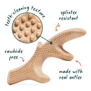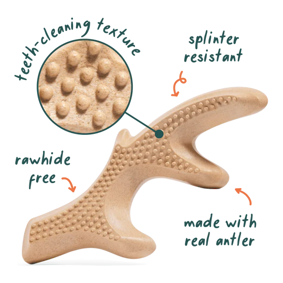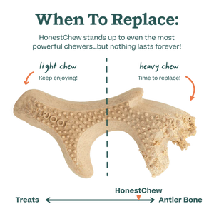 For dogs who chew like it’s their life’s work, the HonestChew Duo keeps them busy — and safe. They’re made from food-grade, plant-based ingredients and real antler bone for gnaw-worthy flavor. The Antler mimics chewing in the wild, while the Infinity Bone’s ergonomic shape makes it a cinch for paws to grip. Both support healthy teeth and help redirect energy away from your furniture. Splinter-resistant. Nylon-and-rawhide free. Built for chewing champs.