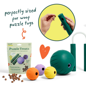 Meet the treat made for longer play. Perfectly sized for Woof puzzle toys, Puzzle Treats turn everyday fun into a tasty, brain-boosting challenge. Crafted with real chicken and brown rice, these protein-rich rewards are air-dried to lock in drool-worthy flavor (and irresistible aroma). Designed to fit Nomchucks, Walkabout, Flyball, and...