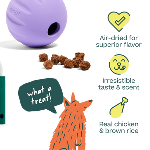 Meet the treat made for longer play. Perfectly sized for Woof puzzle toys, Puzzle Treats turn everyday fun into a tasty, brain-boosting challenge. Crafted with real chicken and brown rice, these protein-rich rewards are air-dried to lock in drool-worthy flavor (and irresistible aroma). Designed to fit Nomchucks, Walkabout, Flyball, and other puzzle or treat dispensing toys.