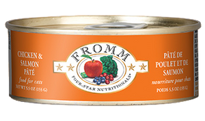 Fromm Chicken And Salmon 5oz Canned Cat Food Description Perfect as a complete meal or accompanying your cats favorite dry food, Fromm Four Star Grain Free Chicken and Salmon Pate Canned Cat Food provides balanced and complete nutrition for all breeds and all stages of life. This recipe is made...