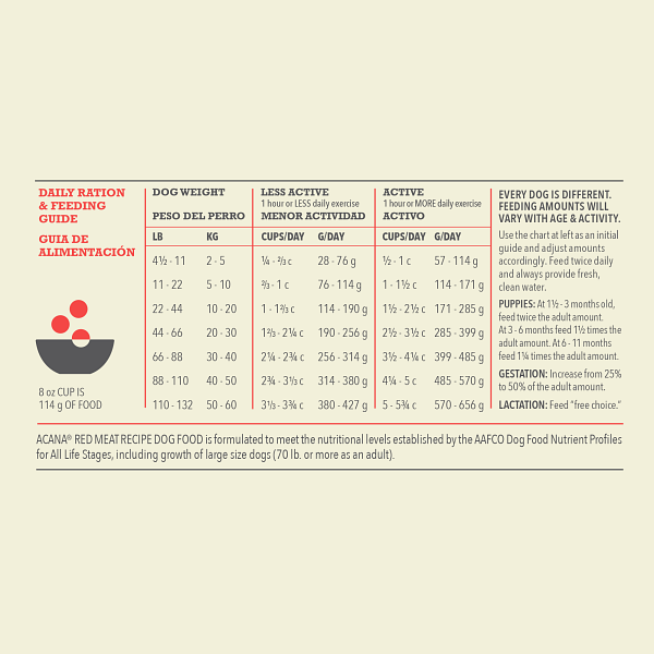 ACANA RED MEAT RECIPE is formulated to meet the nutritional levels established by the AAFCO Dog Food Nutrient Profiles for All Life Stages, including growth of large size dogs (70 lb or more as an adult).