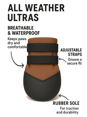 A durable year-round boot that keeps paws protected in every season. All Weather Ultras combine a water-resistant outer shell with a rugged sole, offering both comfort and reliable traction. Perfect for customers who want one boot that works in rain, snow, heat, and everyday walks. Key Features for Retailers: Versatile...