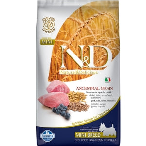 Every Farmina food is made with the best ingredients with the correct amounts of protein, fats, limited carbohydrates and advanced long life vitamins and minerals. The Natural & Delicious high protein, 20% Ancestral Grain formulas are comprised of 60% animal ingredients (pre-cooking weight), 20% organic spelt and organic oats and 20% vegetables, fruits, vitamins and minerals. Delicious Lamb & Blueberry flavor contains no peas, legumes, meals or by-products for nutrition you can feel great about.