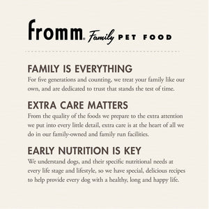 Fromm® Puppy Chicken & Salmon Pâté Food for Dogs is formulated to meet the nutritional levels established by the AAFCO Dog Food Nutrient Profiles for gestation/lactation and growth, including growth of large size dogs (70 lb. or more as an adult).