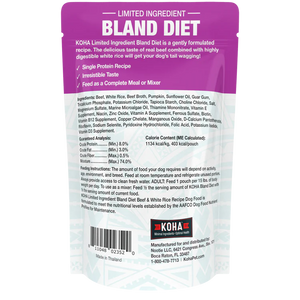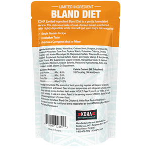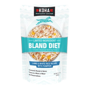 KOHA Bland Diet for dogs is ideal for dogs with upset stomach, loose stool, or diarrhea. This gently formulated limited ingredient dog food recipe has just one protein source for easy digestion. It also includes white rice and pumpkin to support healthy stools and regularity.