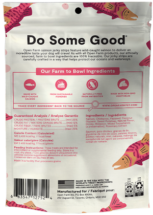 Open Farm wild-caught salmon jerky strips feature OceanWise recommended salmon to deliver an incredible taste your dog will crave! As with all Open Farm products, our ethically sourced, farm to bowl ingredients are 100% traceable. Our jerky strips are crafted in a way that helps protect our oceans and waterways....