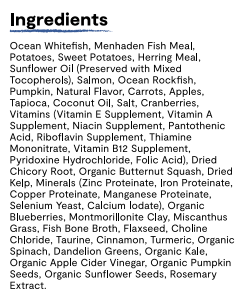 RawMix features our protein-packed kibble covered in a nutritious bone broth and freeze dried raw coating, with added chunks of freeze dried raw. Crafted with a blend of wild-caught whitefish, salmon and rockfish, this delicious recipe includes nutrient-dense meat, organ, and bone with no grains, legumes or any byproducts.