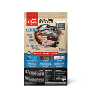 ORIJEN® Amazing Grains is packed with fresh or raw animal protein and enhanced with hand-selected grains to give your dog peak nourishment. With 90%* premium animal ingredients, ORIJEN Original with Amazing Grains includes WholePrey ingredients from free-run** chicken and turkey, and wild-caught fish. These nutrient-dense animal ingredients provide your dog with the protein, vitamins and minerals they need to thrive. We’ve also added only the most amazing grains in a high-quality blend of oats, quinoa and chia and more, hand-selected to provide a balanced fiber ratio that helps support your dog’s digestive health. Nourish your dog completely with the amazing animal protein and quality grains found in ORIJEN Amazing Grains.