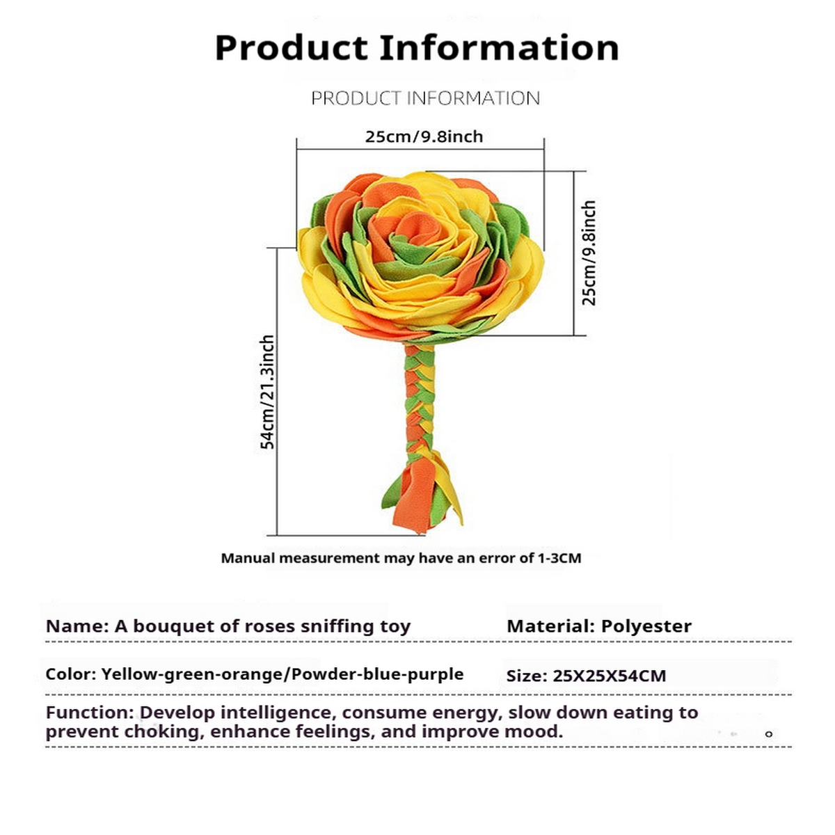 - Category: Chew-Resistant Snuffle Toy - Material: Premium Polar Fleece (180g 100% Polyester) - Dimensions: 25×25×54cm (9.8×9.8×21.3 in) - Weight: 180g (6.35oz)