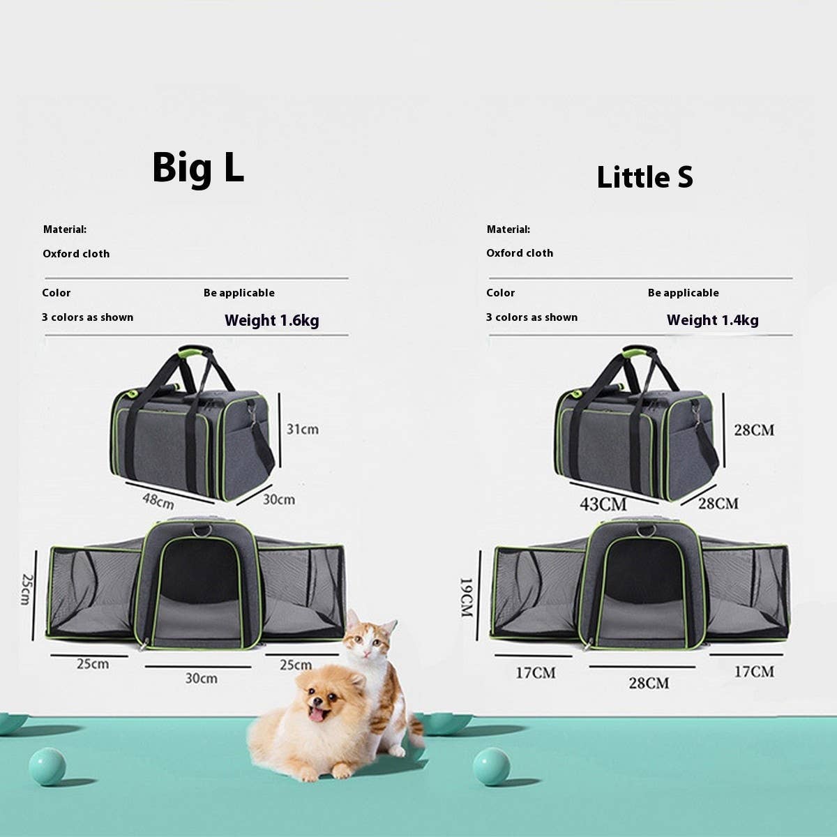 -Product Type: Expandable Pet Carrier -Material: Oxford Fabric -Dimensions: S: 43×28×28cm / 16.9"×11.0"×11.0" L: 48×30×31cm / 18.9"×11.8"×12.2"