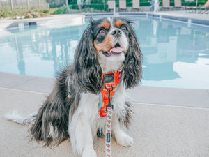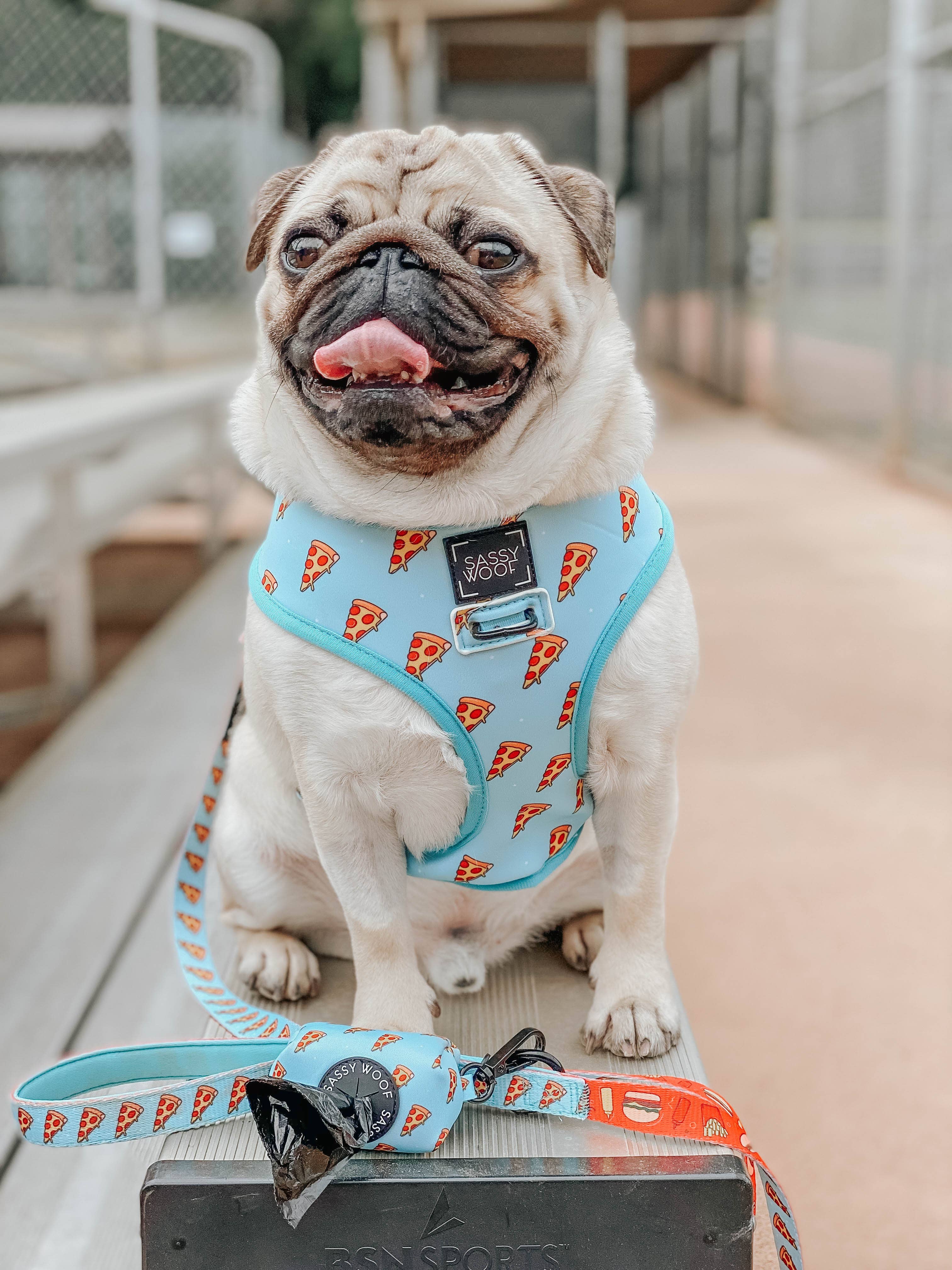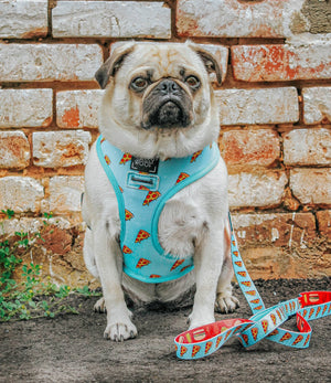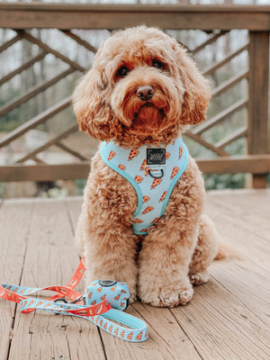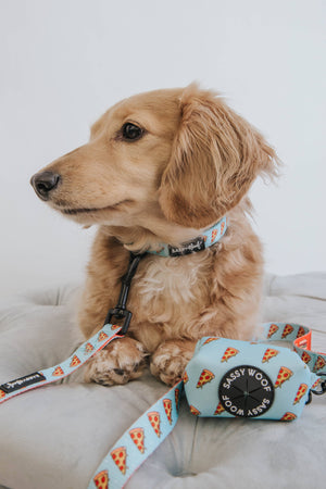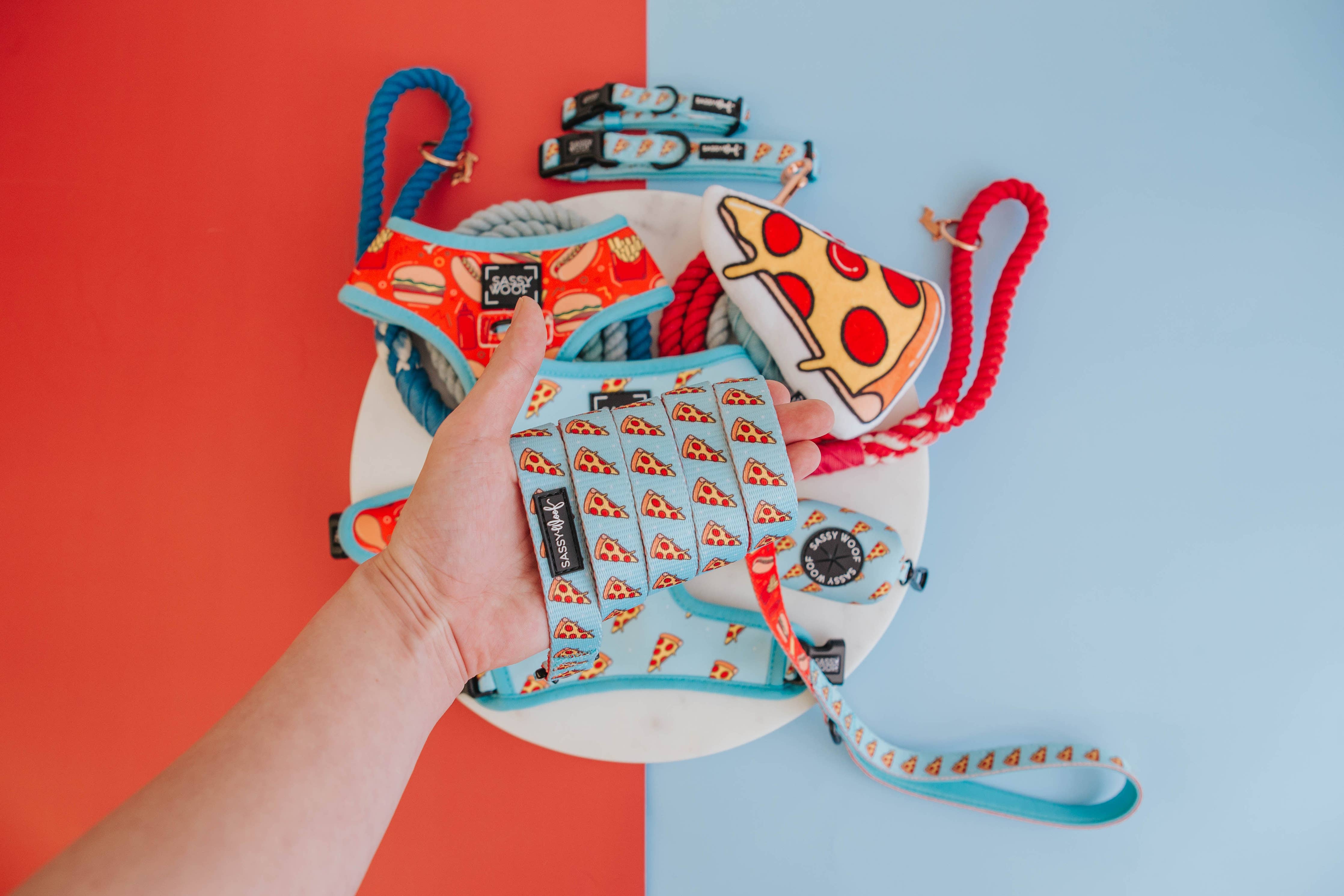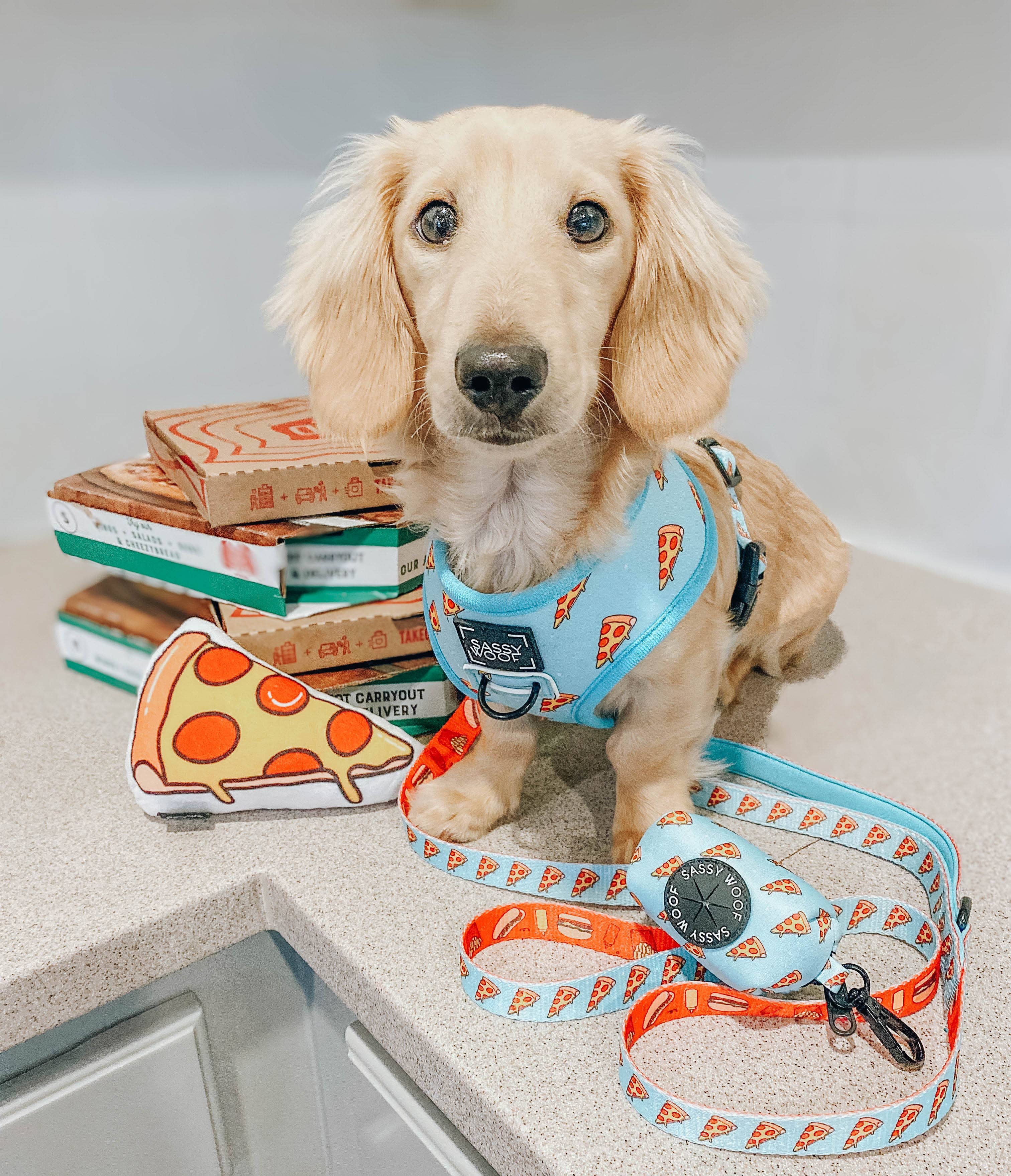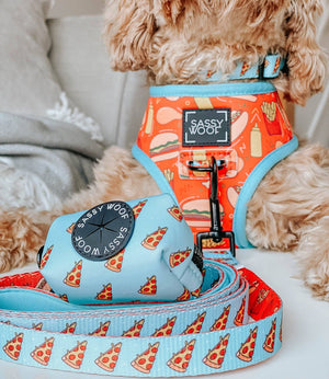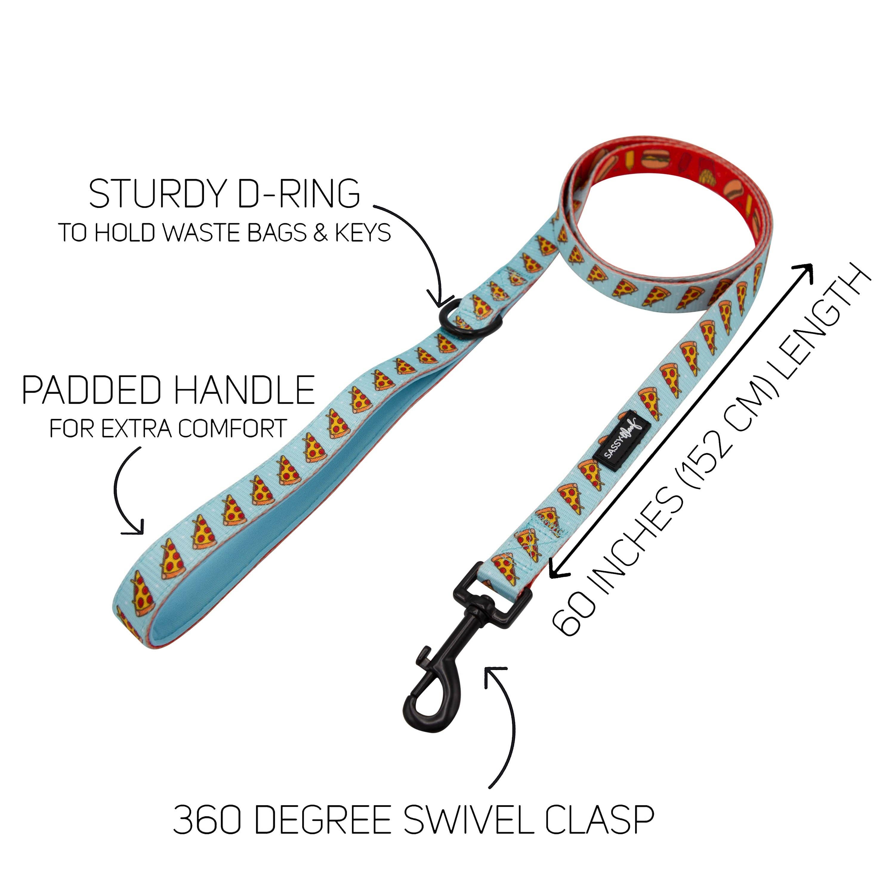 Get a pizza this leash! Our 'One Hot Pupperoni' collection is to drool for! Description: - 60" in length and 0.8" in width - Padded with neoprene handle for extra comfort for the humans - Sturdy D-Ring at the base of the handle to hold waste bags and keys - Complete the set with our matching reversible harness, collar, and waste bag holder Care Instructions: - Spot clean only with water and soap