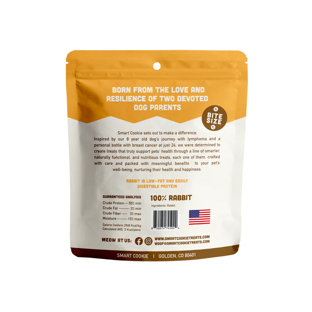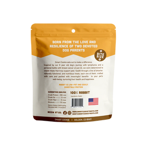 Lean Missouri rabbit and velvety pumpkin come together for this tender, bite-sized, hypoallergenic treat. These dog treats are made with novel ingredients from USA Central Lowlands, ethically sourced single animal protein, and handcrafted in our Colorado kitchen.