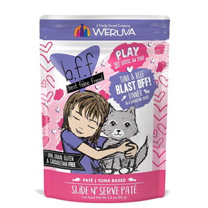 It€™s time to PLAY€¦ for dinner!? That€™s right, new B.F.F. Pat© Lovers Aw Yeah! recipes are what your best feline friend has been asking for. Grain, gluten, carrageenan, and starch free means that these playful pat©s are sure to please even the pickiest of pals. Available in cans and pouches in three protein options; chicken only, fish only, and mixed protein recipes.