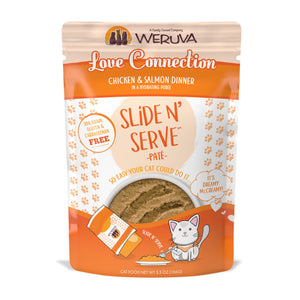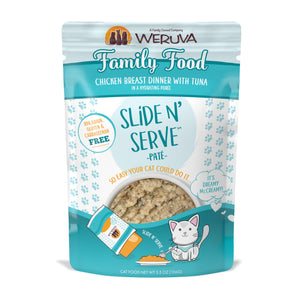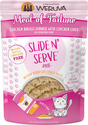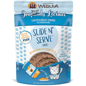 Each recyclable pouch holds a complete and balanced meal of pate made with real chicken and savory chicken broth as the top ingredients. Plus, every pet parent will enjoy Weruva's convenient Slide N' Serve packaging - simply open the pouch, slide the food out and prepare to your cat's purr-eference. Best of all, every Slide N' Serve recipe is grain-free, gluten-free and carrageenan-free, so you can feed your cat with complete confidence. Winner, winner chicken dinner!