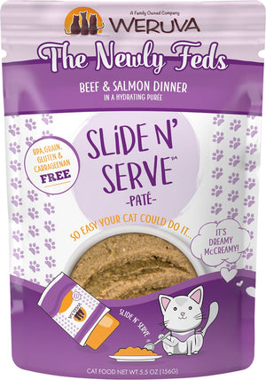 - Each serving comes in an easy-to-use recyclable Slide N' Serve pouch - simply open the pouch, slide the food out and prepare to your cat's content.