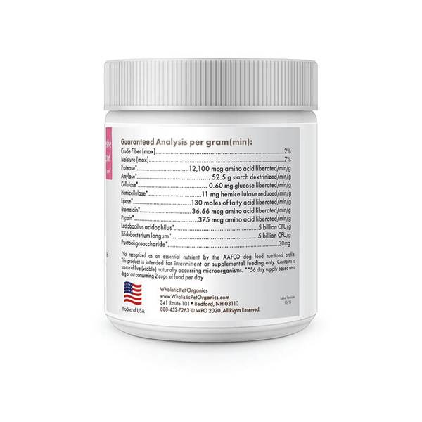 Of the three major classes of enzymes, digestive enzymes are responsible for breaking down food into its constituent nutrients for the body to utilize. Different enzymes break down different foods. When enzyme stores are low, it is harder for the digestive system to break down fats, protein, and carbohydrates. Poor digestion can cause pets to suffer from constipation, diarrhea, flatulence, and more. Wholistic Digest-All Plus™ is a unique enzyme blend of pure, freeze-dried, plant, and plant-based enzymes with added maximum concentrations of prebiotics and probiotics. Formulated for maximum digestive support!