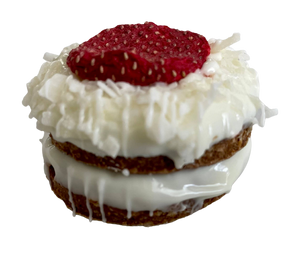All human grade, natural ingredients in YumYum4DOGS classic peanut buttter recipe, these double decker strawberry shortcake bites are delectable! Layered with yogurt icing & coconut shavings the aroma is to die for. Top with a dried strawberry & you have a best seller!